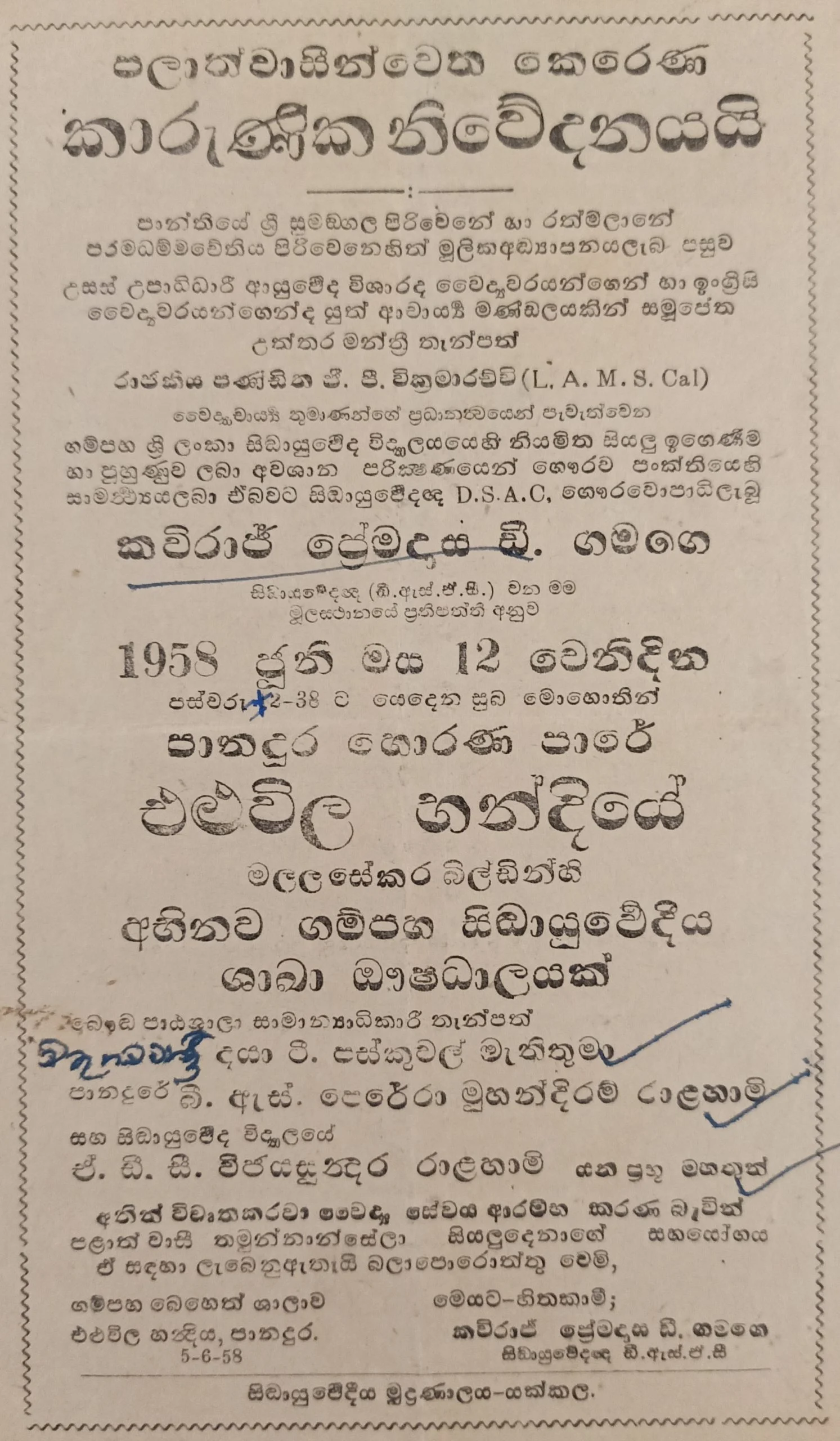 The well-known “Gampaha Ayurvedic Dispensary and Pharmaceutical Factory” in Eluwila, Panadura, which has a constant history of more than six decades, was founded in 1956 by Ayurvedic Physician KAVIRAJ Premadasa Don Gamage. (Siddhayurvedagna DSAC)